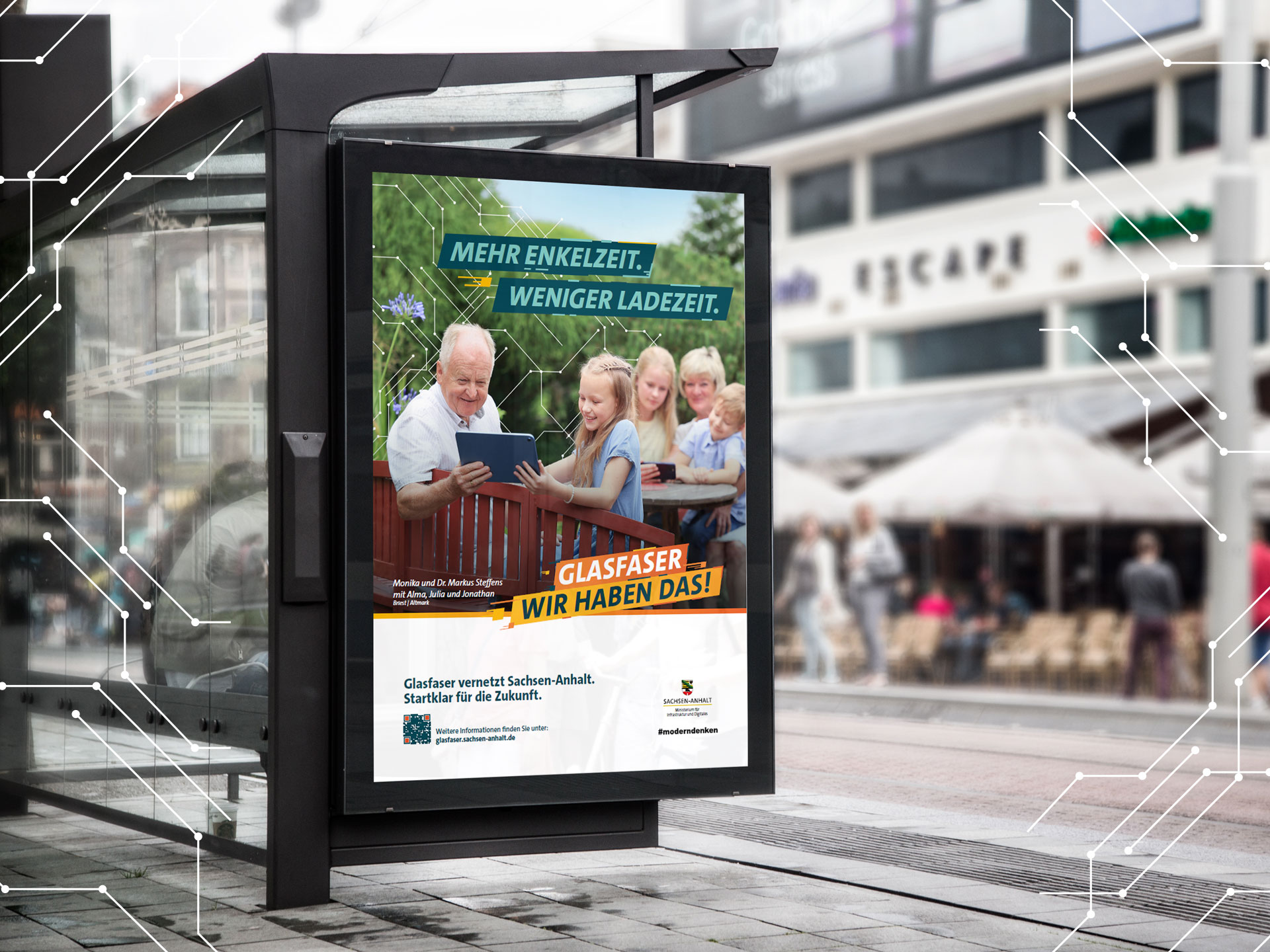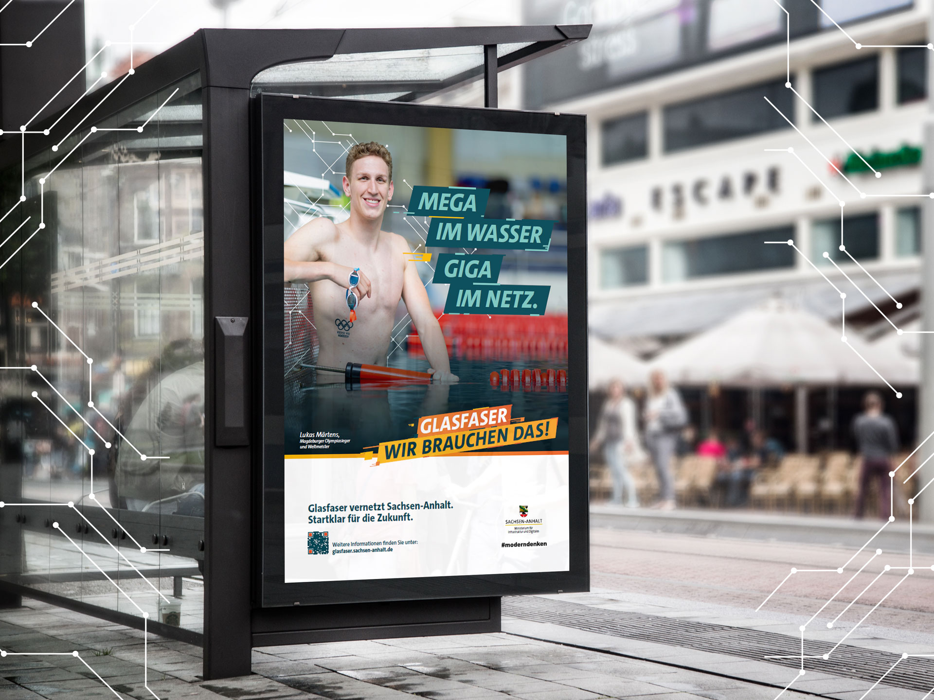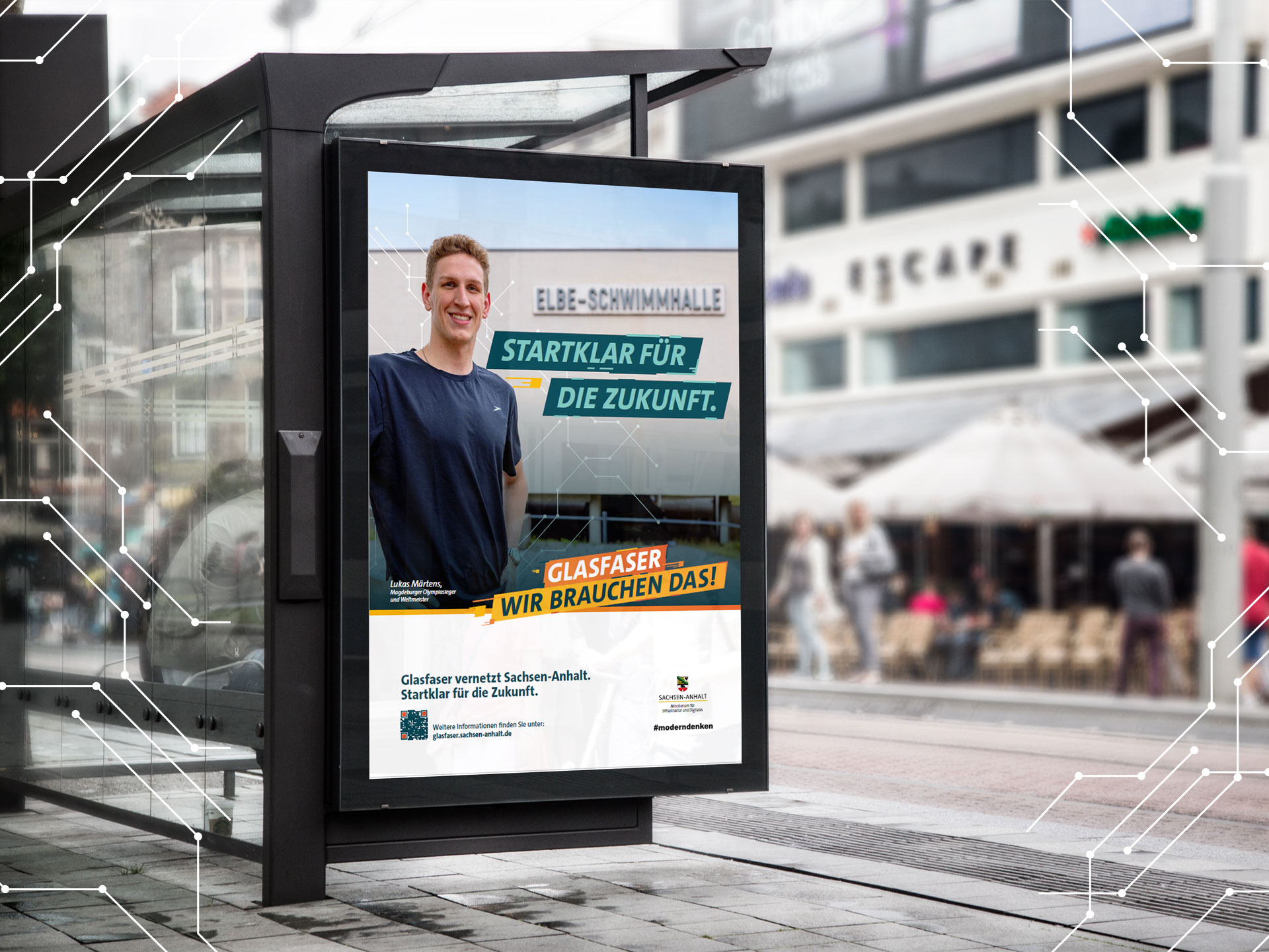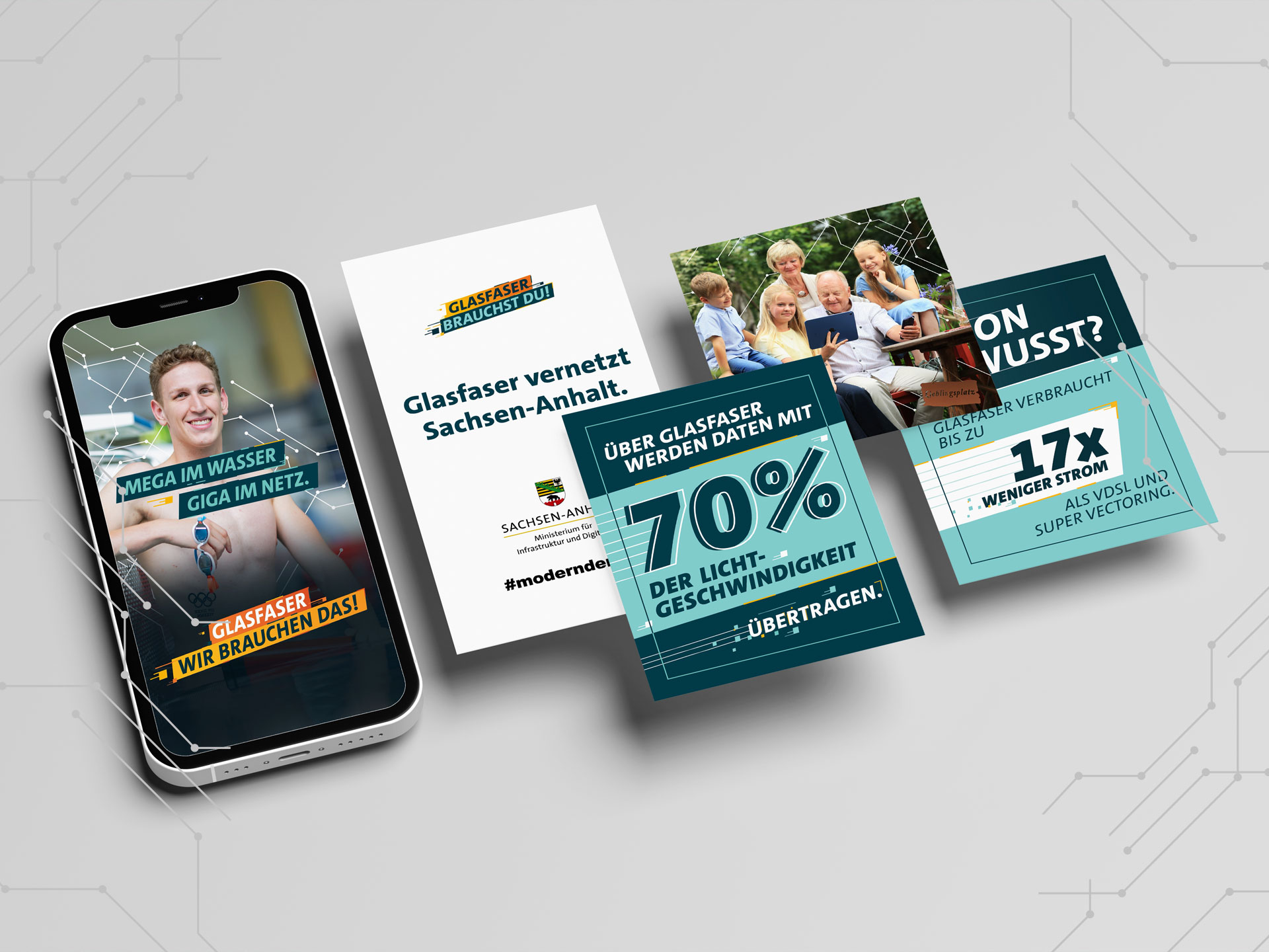 Mit den Claims „Glasfaser – wir brauchen das. Glasfaser – wir haben das.“ verbindet die Kampagne Zukunftsorientierung mit regionalem Fortschritt. In der diesjährigen Kampagne standen auch wieder authentische Gesichter aus Sachsen-Anhalt im Mittelpunkt – etwa Schwimmstar Lukas Märtens als Botschafter für Tempo, Leistung und Durchhaltevermögen und Familie Steffens als Nutzer aus der Altmark.